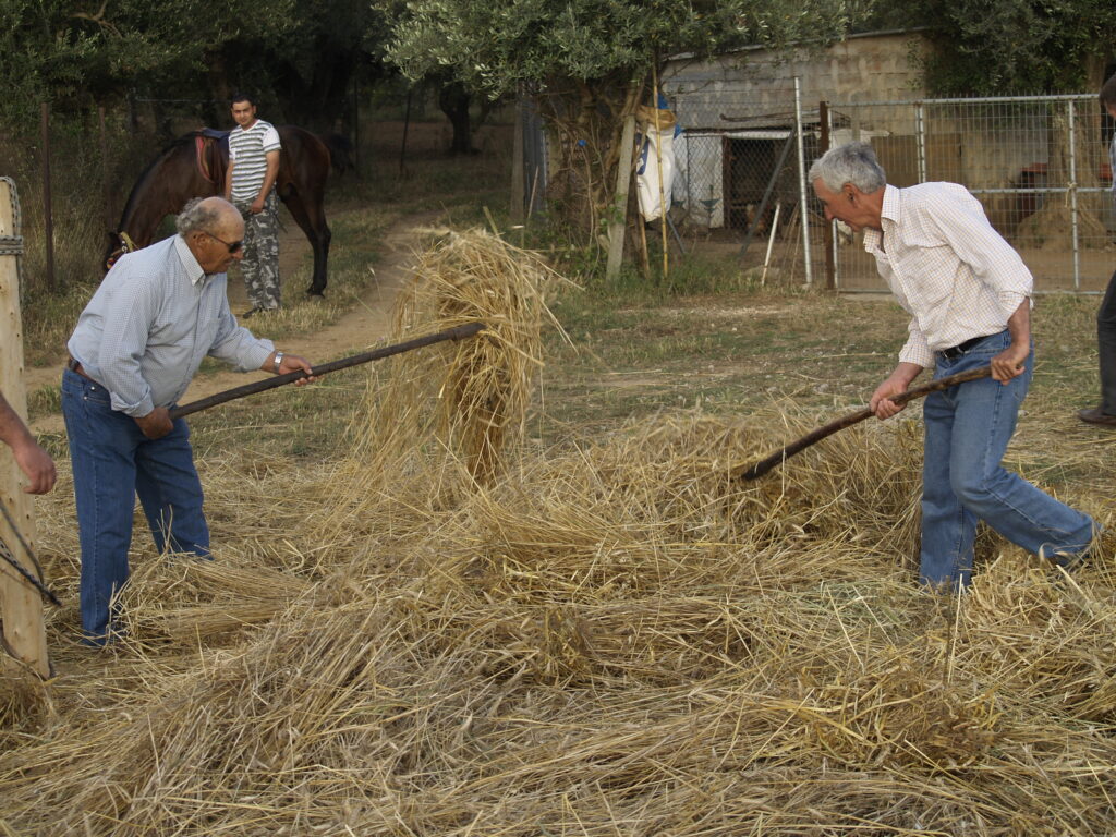 Σιγά σιγά άρχισαν να απλώνουν κυκλικά τα δεμάτια και ο αγωγιάτης, χτυπώντας ελαφρά το άλογο με το καμουτσίκι, αρχίζει να γυρίζει, γύρω γύρω, μέχρι τα χειρόβολα να γίνουν άχυρο.